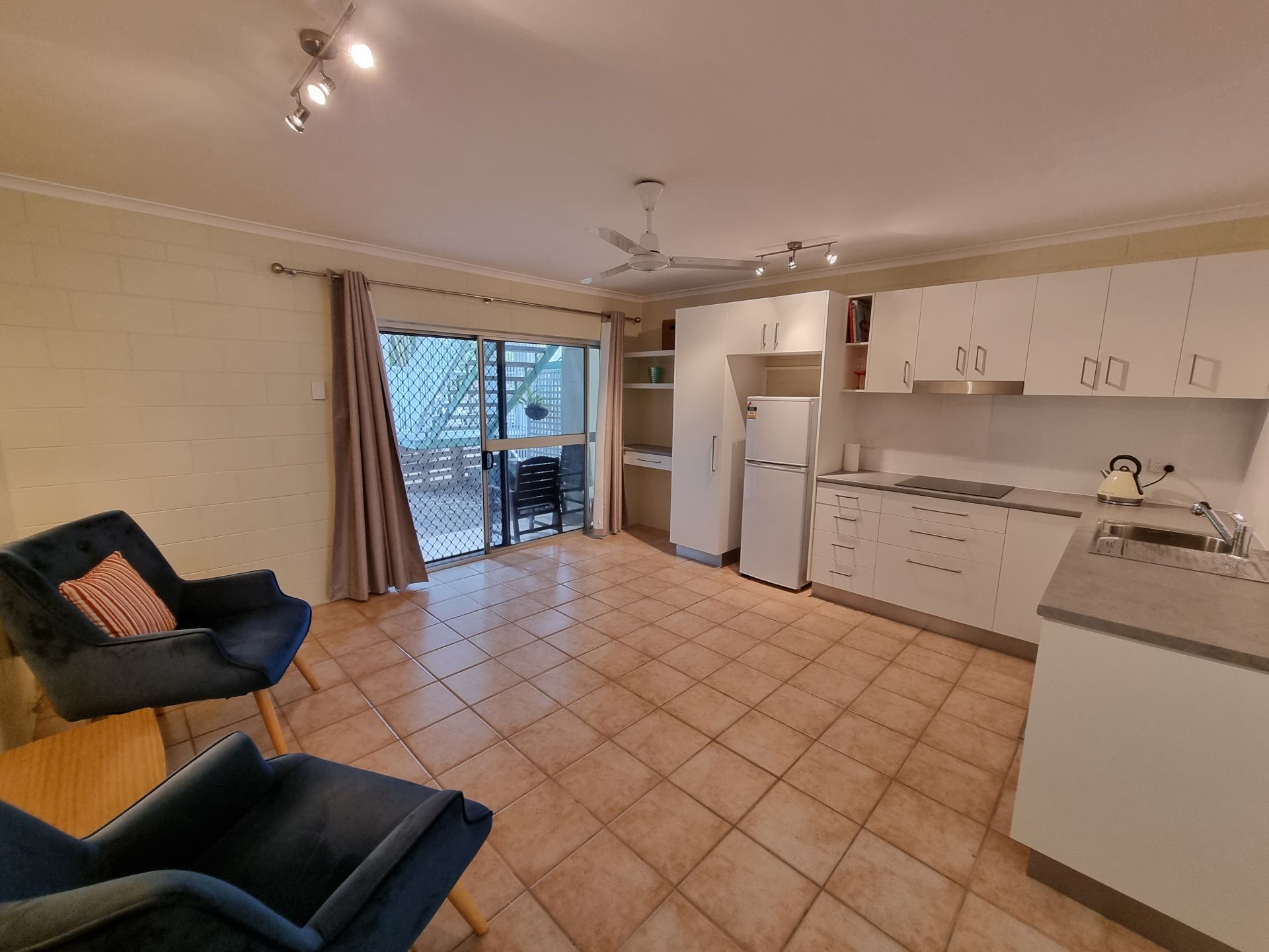 - Ground floor furnished apartment with open plan design.